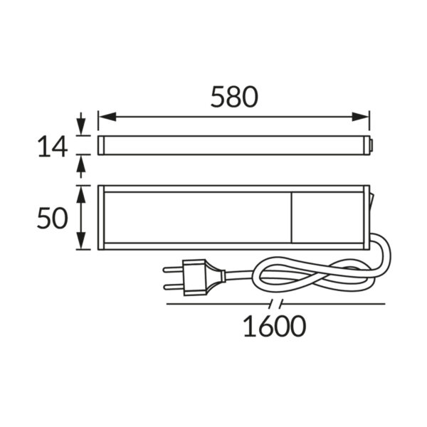 Izmēri: ~14 mm (augstums) × 580 mm (platums) × 50 mm (dziļums).